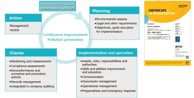 Our company has established and operates an Environmental Management System (EMS) based on the international standard ISO 14001. In February 2004, SANKYO Shizuoka Manufacturing Plant obtained ISO 14001 certification for the design, development, manufacturing, and related services (modifications, repairs, overhauls, and maintenance/inspection) of cam devices, cam-type indexing devices, precision reduction gears, feeder devices for press machines, their application equipment, and peripheral devices.